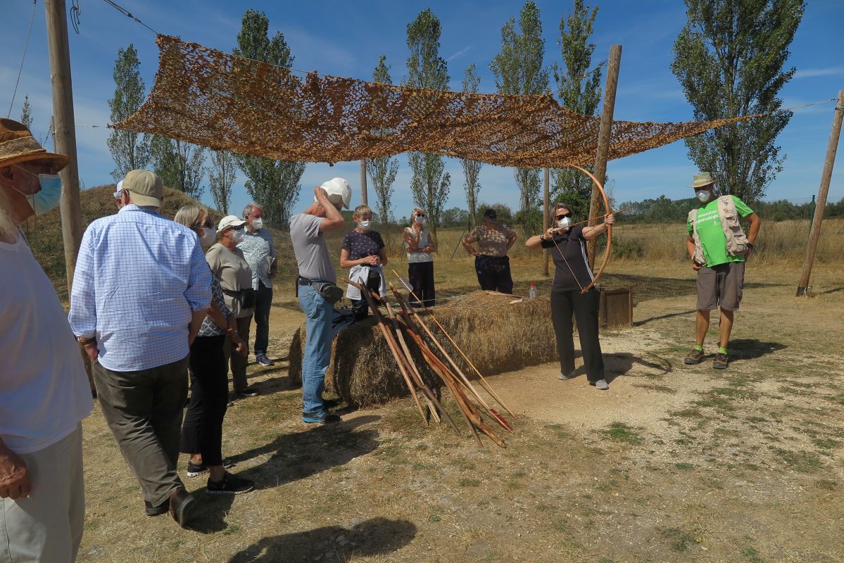 Nach diesem eindrücklichen Besuch der Fundstellen fahren wir ins nahe gelegene CAREX, dem Zentrum für experimentelle Archäologie. Hier zeigt uns der spanische Archäologe wie der Homo habilis, unser vor rund 2,5 Millionen Jahren in Ostafrika lebender Vorfahre bereits Geröllwerkzeuge herstellte. Auch konnten wir es selbst probieren, was aber nicht so einfach war. An einer anderen Stelle fertigte unser Guide in wenigen Minuten vor unseren Augen einen Faustkeil an, demonstrierte die Steinbearbeitung des Neandertalers und erklärte uns die Sprühtechnik für das Anfertigen von Höhlenmalereien. Eindrücklich war auch die Technik des Feuerbohrens, die mit Geschick schnell ein Feuer entfachen lässt. Auch konnten wir uns selber testen, wie man einen Speer mit Hilfe der Speerschleuder wirft oder einen Pfeil mit dem Bogen.