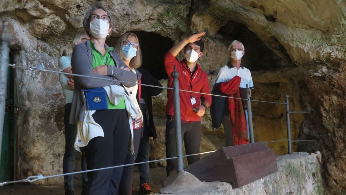 Vom Zugangsweg, der zur Höhle führt, gibt es einen schönen Blick auf die asturische Landschaft. Die Höhle birgt nebst den Wanddarstellungen auch wunderschöne Tropfsteinformationen. Im grossen Saal angekommen, stehen wir mit grosser Ehrfurcht vor der „Wand der Gravierungen“ und folgen den Erklärungen unserer lokalen Führerin und den Ergänzungen unseres archäologischen Reiseleiters. Wir sind überglücklich, nun echte Darstellungen zu sehen, die ein Alter zwischen rund 30'000 und 15'000 Jahren vor heute haben. Diese sind zum Teil hoch an der Wand angefertigt worden, und dies konnte nur mit Hilfe von Gerüsten passieren. Nach dieser ersten „Reise in die Unterwelt“ kehren wir zufrieden zurück zum Interpretationszentrum, um der zweiten Gruppe den Platz frei für die Höhle zu machen.