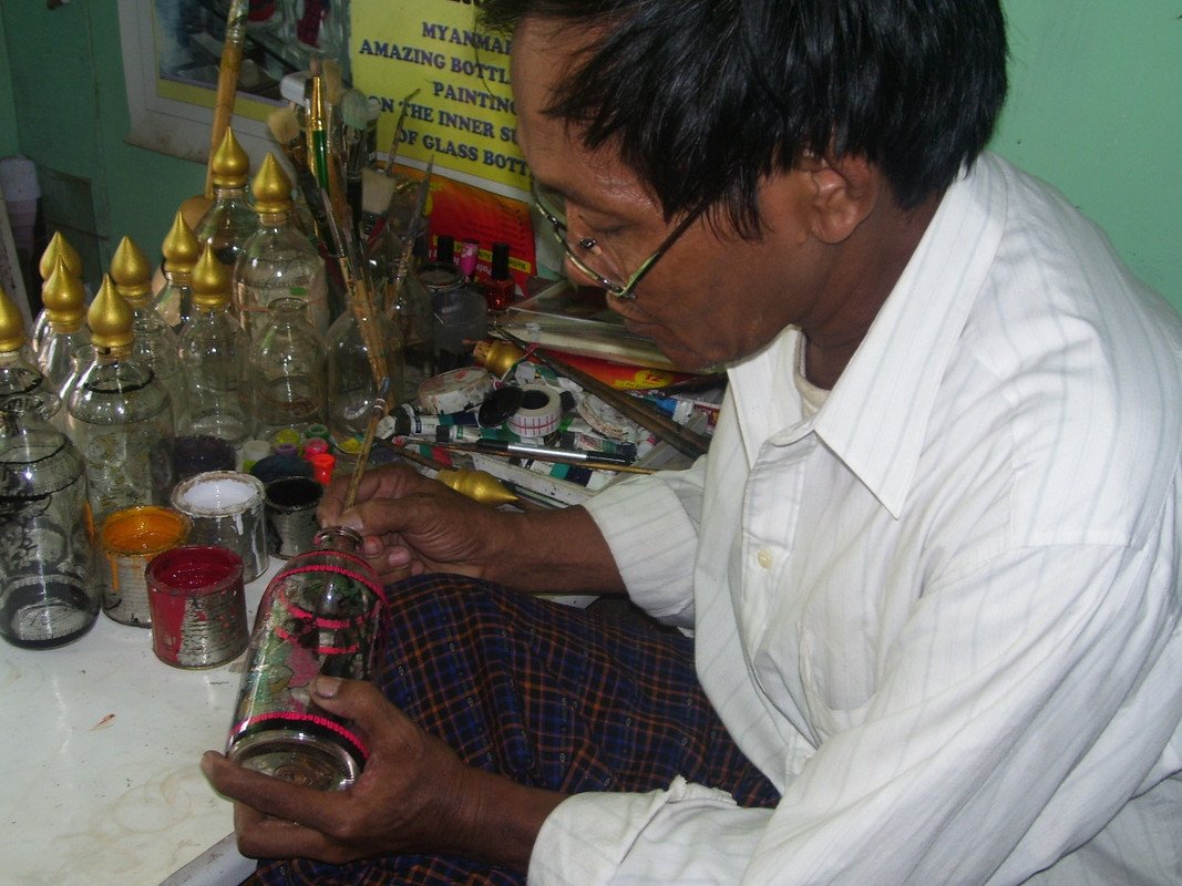 Schließlich geht es nach Amarapura um U Chit Mya zu treffen. Er ist einer der wenigen Künstler, der die aussterbende Kunst der Flaschen- und Glasmalerei am Leben erhält. Sein Großvater brachte ihm die Technik bei auf getrockneten Kürbis- und Kokosnussschalen sowie auf Glas und Flaschen Kunstwerke entstehen zu lassen. Auch seine Frau hilft bei den Zeichnungen und überdies ist sein ältester Sohn auf die Herstellung von Blumenreliefs aus Holz spezialisiert.