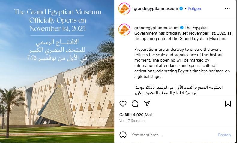 Termin im November 2025 ausgebucht. Eine Reise nach Kairo zum GEM ist auch im Februar 2026 vorgesehen. Außerdem besuchen wir das Grand Egyptian Museum im Rahmen der geplanten Ägypten Herbstreise 2026 - Gerne setzen wir Sie auf die Interessentenliste office@zugvogeltouristik.at