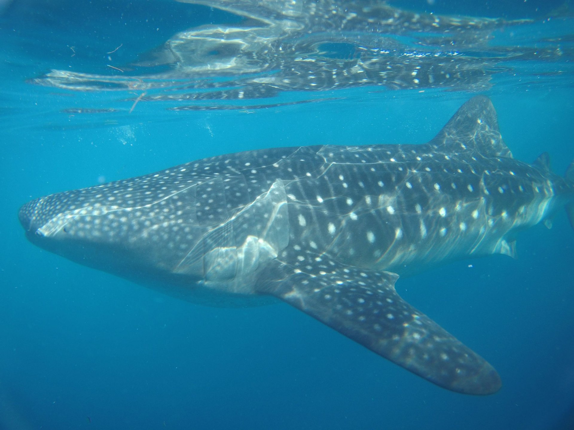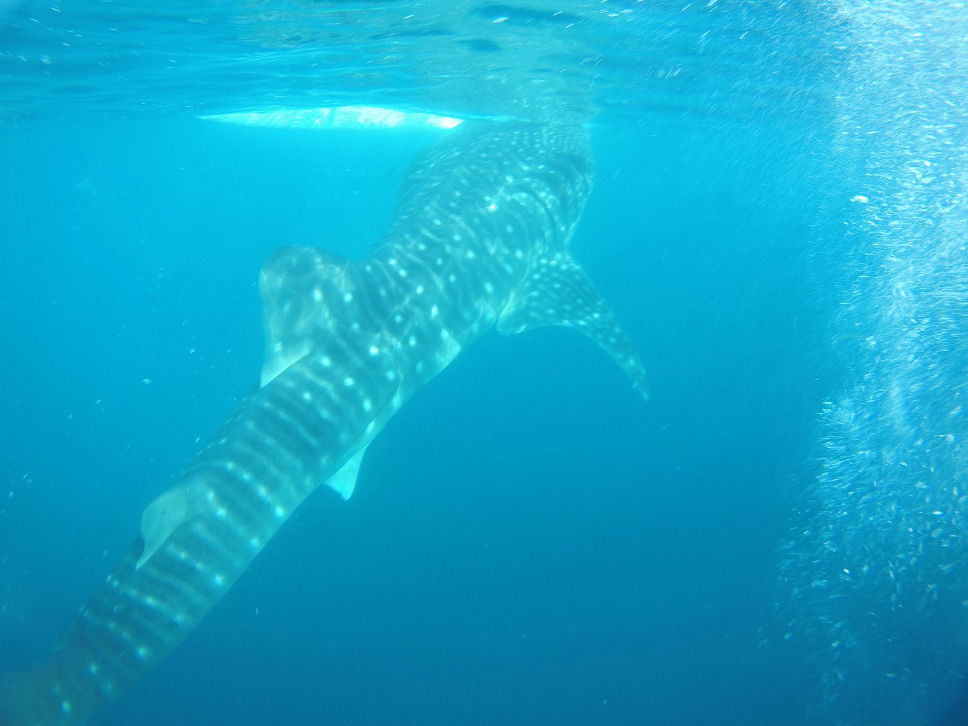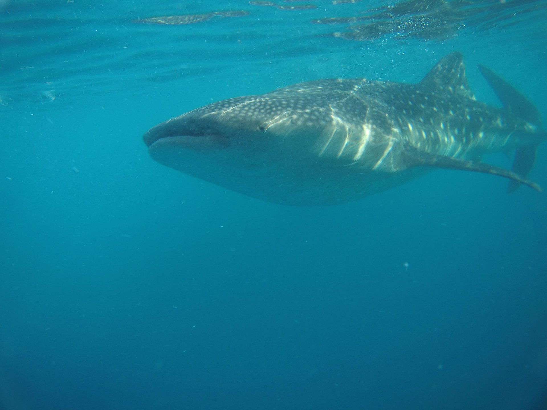 Atemlos tauchen wir wieder auf und können es nicht fassen, dass schließlich angelockt vom Futter, das aus einem Boot verteilt wird, nacheinander tatsächlich mehrere der riesigen Haie an uns vorbeischwimmen. Diesen größten Fisch des Meeres so nah zu erleben ist einmalig und wir genießen einfach nur den Moment. Es geht uns fast zu schnell, nach einer guten halben Stunde sind wir wieder zurück an Land, gehen duschen und werden zu unserem Hotel zurückgebracht.