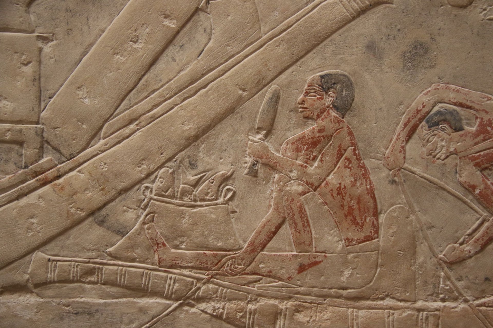 Als erstes besichtigten wir die in einem separaten Gebäude ausgestellte Sonnenbarke des Cheops, die zerlegt in einer Grube neben seiner Pyramide aufgefunden worden war und sich als komplett erhalten erwies. Ein Stahlgerippe neben diesem ältesten komplett erhaltenen Schiff der Menschheit soll in Kürze den Relikten der zweiten, allerdings stark zerstört geborgenen Barke desselben Pharaos nach umfangreichen Restaurierungen den nötigen Halt gewähren.