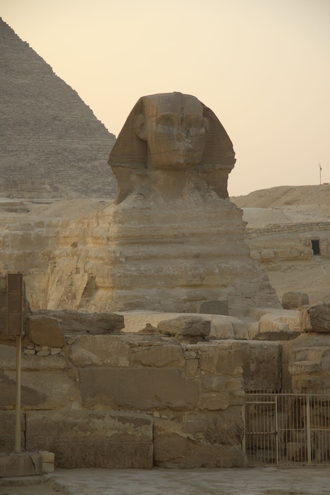 Bevor wir dem Areal von Giza mit dieser Pyramide und denjenigen von Chefren und Mykerinos einen Besuch abstatteten, stand noch ein Abstecher nach Memphis, der Landeshauptstadt im Alten und Mittleren Reich, auf dem Programm. Hier beeindruckten vor allem zwei großformatige Skulpturen, nämlich eine heute unter einem Schutzbau liegende kolossale Standfigur Ramses‘ II. und eine Sphinxfigur aus Alabaster aus dem Neuen Reich, deren genaue Zuweisung mangels Inschriften noch umstritten ist