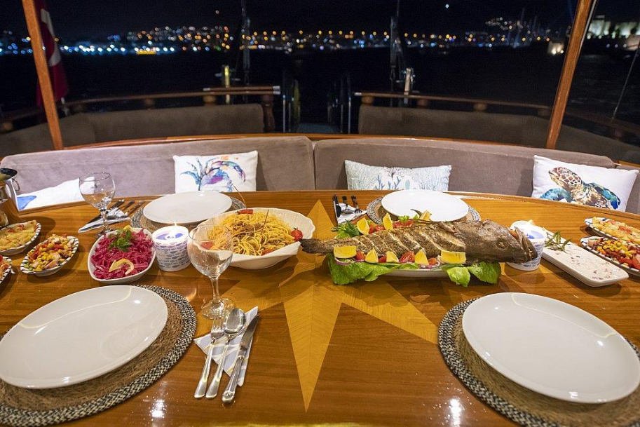 Der langen Besichtigung schließt sich ein verspätetes Mittagessen im nahegelegenen Ort Dalyan an, die einzige Mahlzeit der Tour, die wir aus Zeitgründen nicht an Bord einnehmen. Bei sehr leckerem mediterranen Essen in dem feinen Restaurant hatten wir einen Logenplatz mit Blick auf die beeindruckenden Felsengräber. Dann bringt uns unsere Ausflugsbarkasse wieder zurück zum Schiff, diesmal bei etwas mehr Wellengang.