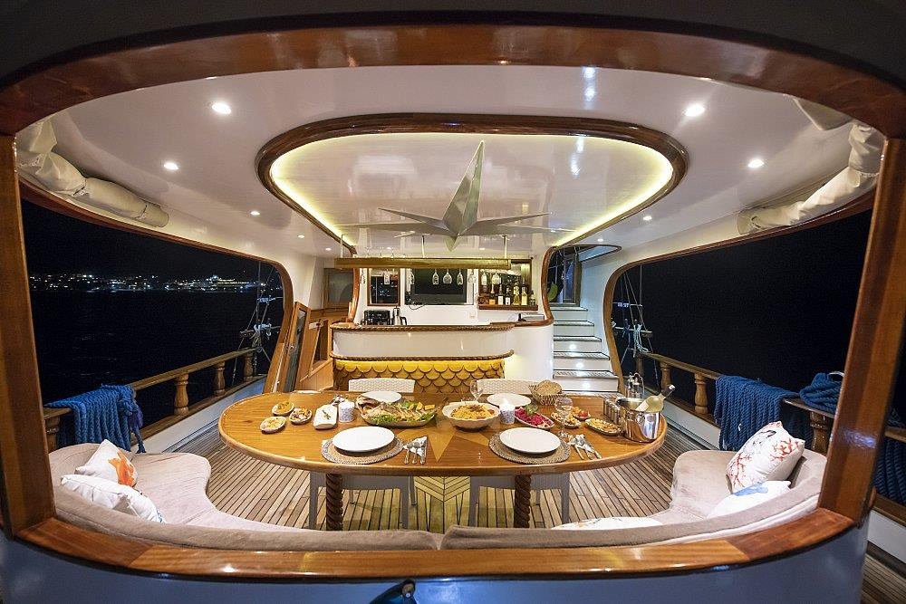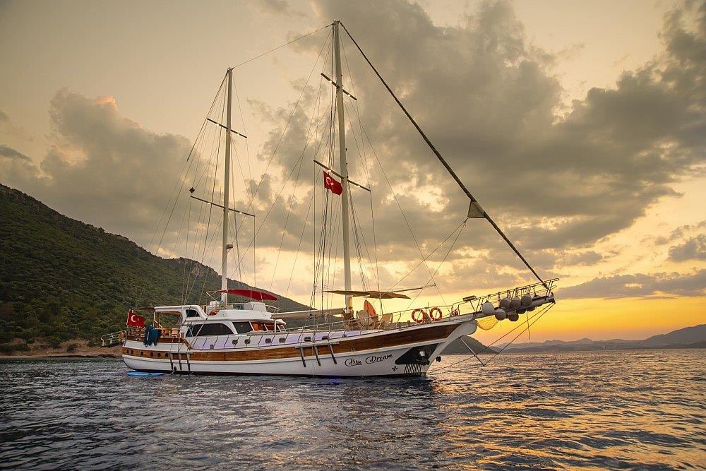 Im Lauf des Samstags kommen alle Mitreisenden sukzessive am Flughafen Bodrum-Milas an und werden individuell nach Bodrum gebracht. Bevor es an Bord geht, besteht im Hafenviertel noch die Möglichkeit zum Einkauf von individuellen Getränken (Alkoholika), die sonst auf dem Boot nicht vorrätig sind. Dann bringt uns ein Beiboot an Bord des Gulet. Damit wird ein zumeist zweimastiger Motorsegler aus Holz bezeichnet, der für die Region um Bodrum, das antike Karien, an der türkischen Südwestküste typisch ist und in ähnlicher Bauweise schon im Altertum Handelsgüter auf dem Meer transportierte. Wir besteigen mit der „Blu Dream“ ein kleines Schmuckstück mit vier Doppelkabinen und vier Mann Besatzung.
