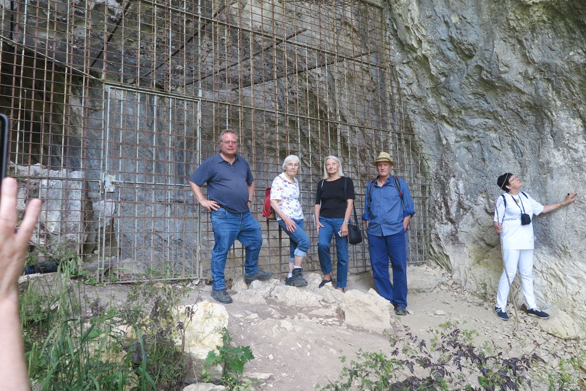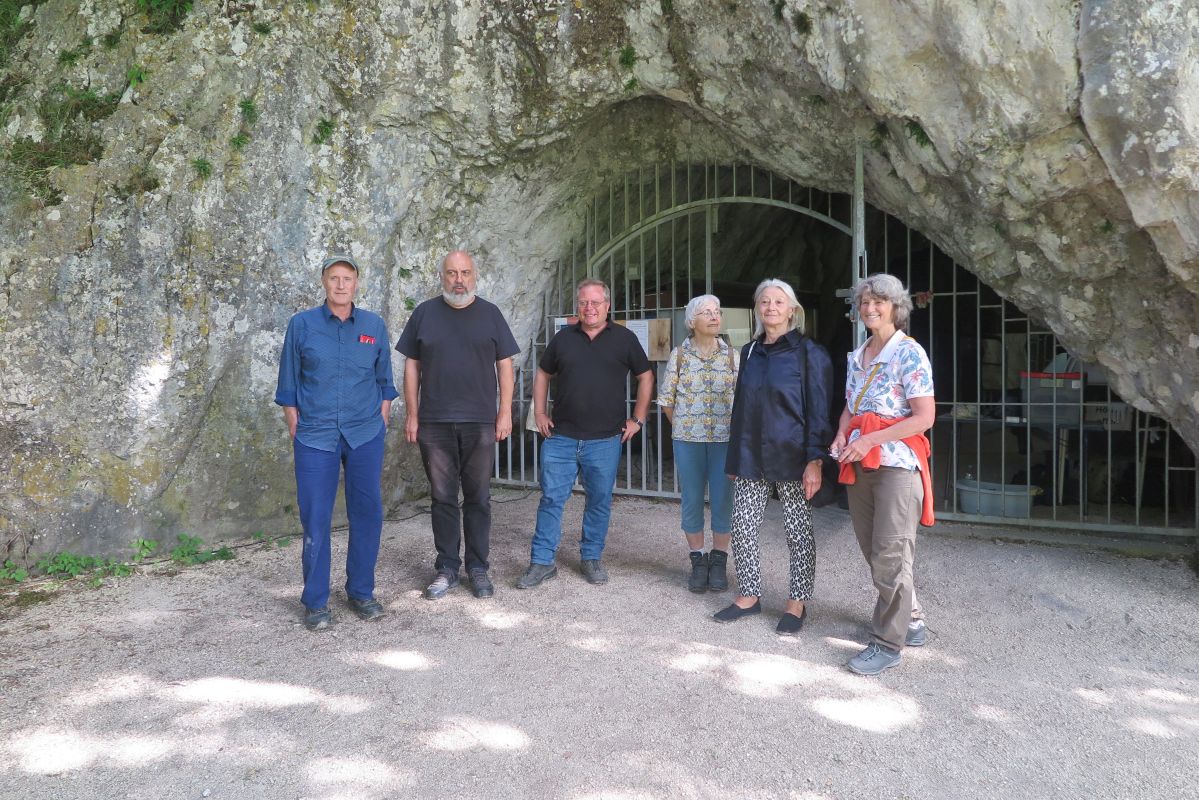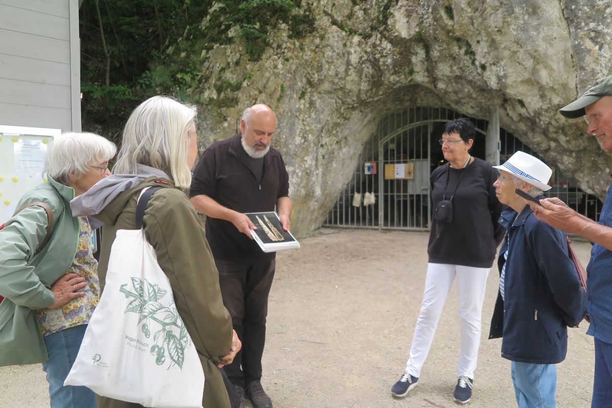 Der nächste Tag führt uns wieder ins Achtal. Wir erkunden gemeinsam mit unserem archäologischen Reiseleiter Dr.rer.nat. Ingmar Braun die Region, lauschen seinen Ausführungen und besuchen die Fundorte. Zunächst wandern wir zum Geissenklösterle. Über einen von der Talsohle angelegten Weg geht es aufwärts zur Fundstelle, die mit einem grossen Gitter verschlossen ist. Ingmar Braun erläutert die Forschungsgeschichte und die wichtigsten Funde, darunter auch aurignacienzeitliche Figurinen aus Mammutelfenbein.
