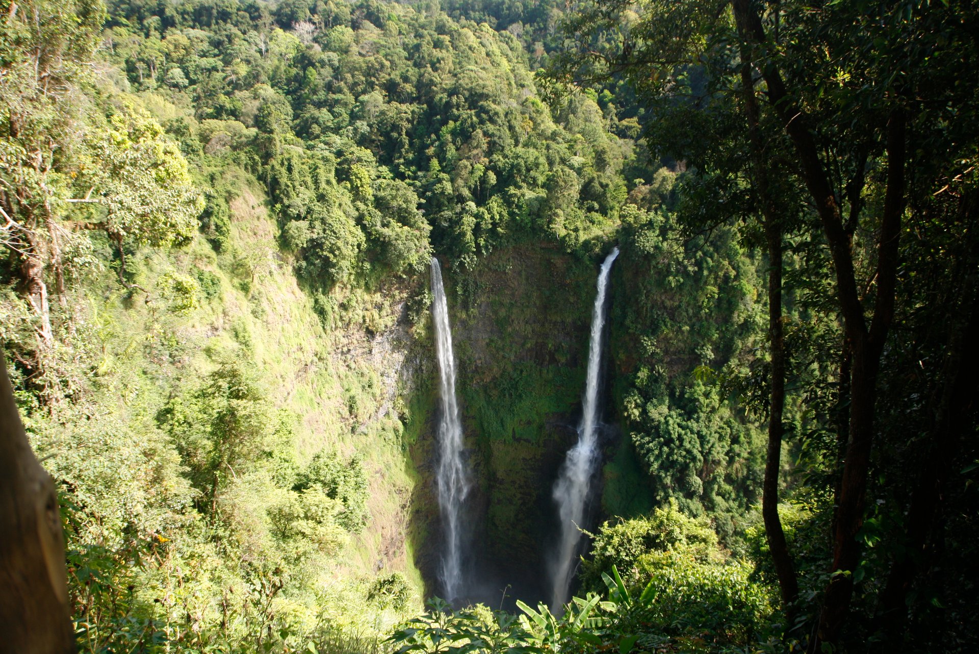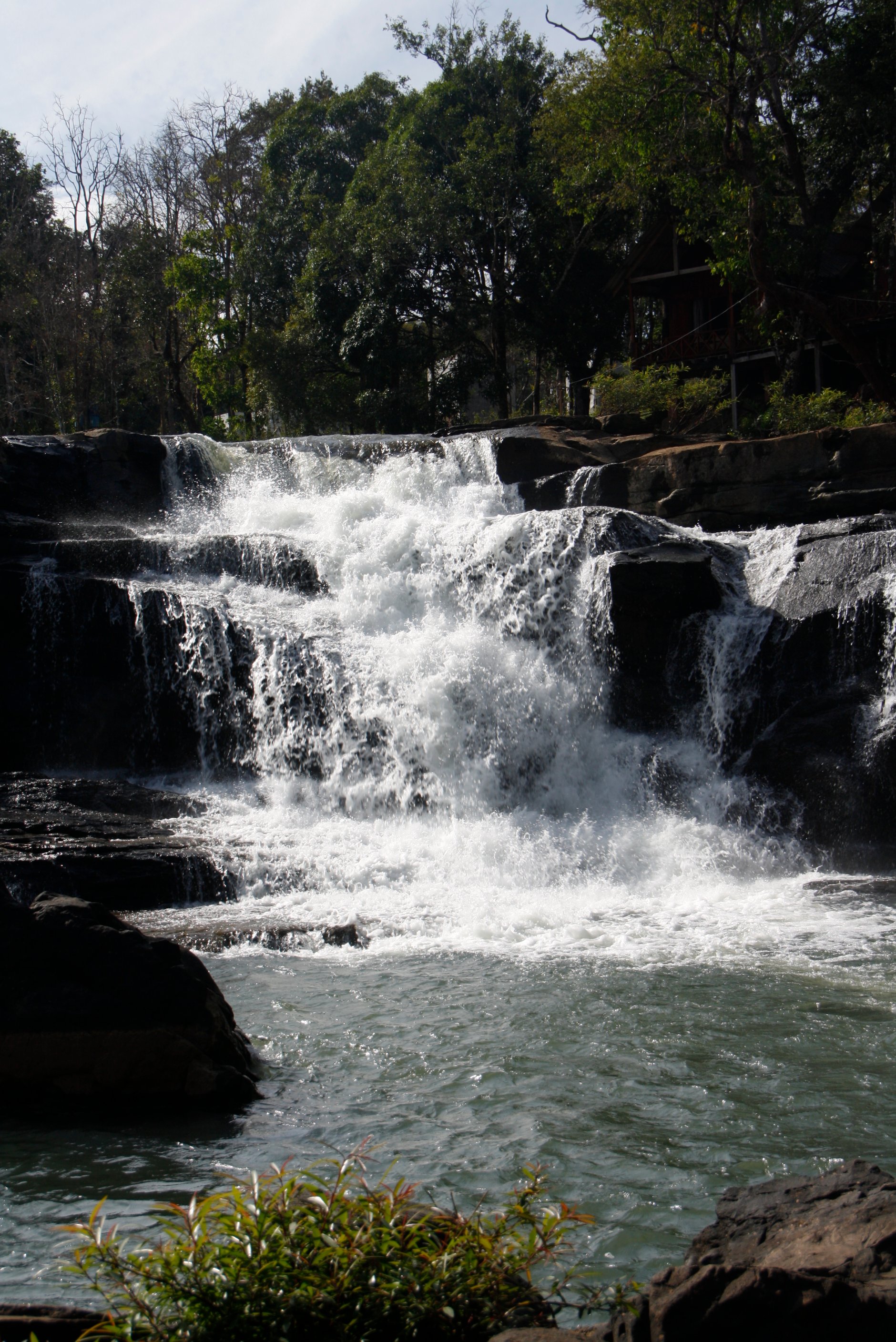 Bergauf geht die Fahrt weiter. Die Straße ist gesäumt von Tee- und Kaffeeplantagen, wir halten für einen kurzen Ausblick an. Bald erreichen wir den Tad Fane Wasserfall, wo das Wasser auf spektakuläre Weise aus dichtem Wald in die Tiefe stürzt, bestens vom Aussichtspunkt des Tad Fane Resort zu beobachten, wo wir auch zu Mittag essen. Als „Reise-Junkie“ lasse ich mir noch die Hotelanlage und ein paar Zimmer zeigen. Die sind schlicht gehalten und gepflegt und, direkt gegenüber dem Wasserfall, absolut idyllisch gelegen.