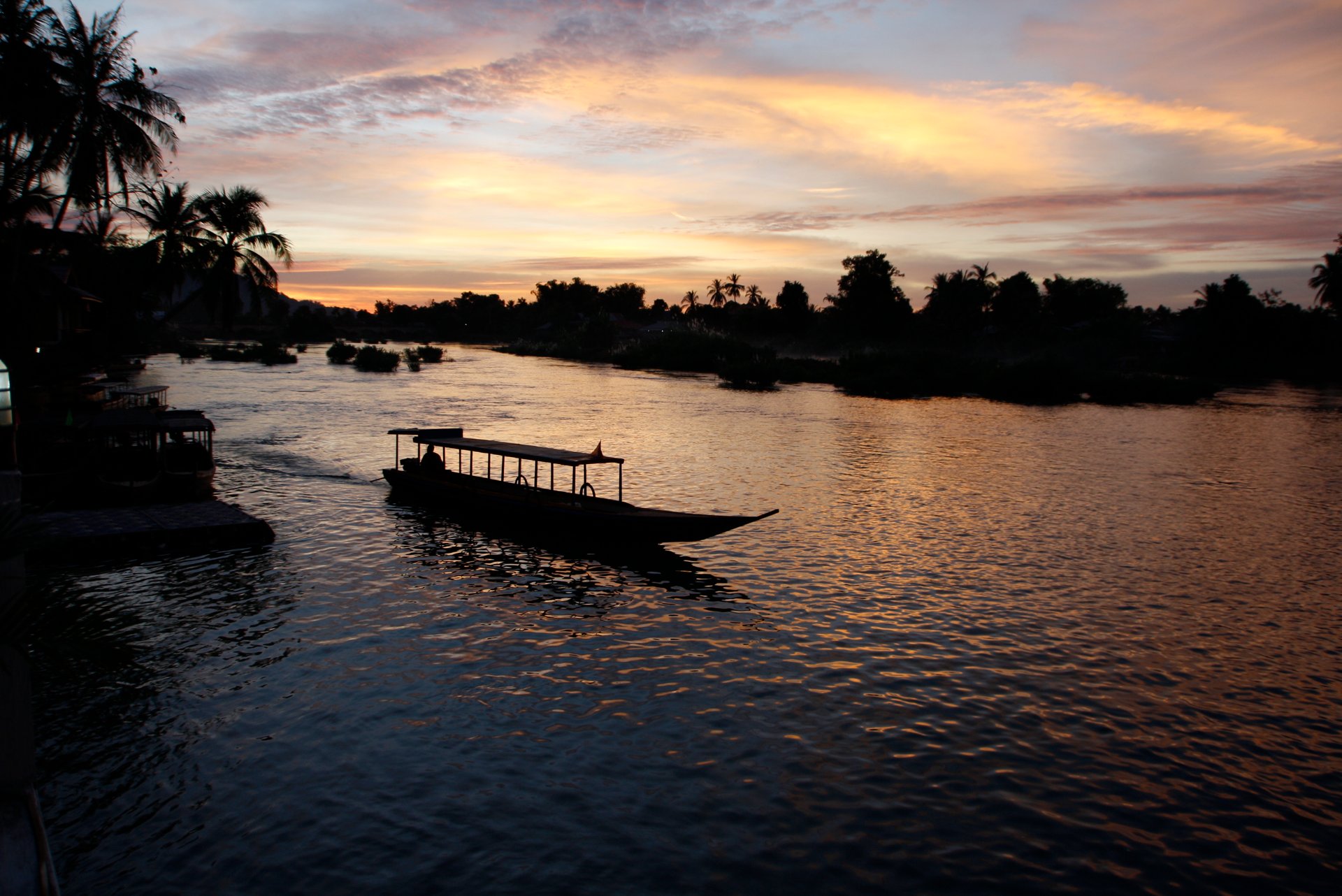 Doch wir sind nicht der kolonialen Relikte wegen hierher gekommen, sondern wir wollen einen der wenigen noch lebenden Mekong-Delphine sehen, von denen es hier gerade mal noch eine handvoll Exemplare gibt. Mr. Thammanoune beantwortet meine Frage nach unseren Chancen asiatisch gelassen: „Manchmal sieht man einen, manchmal nicht“. Die besten Aussichten bestehen laut Reiseführer in der Morgen- bzw. Abenddämmerung. Es ist halb fünf, die Sonne steht flach am Horizont. Wir fragen einen britischen Touristen, dessen Boot anlegt. Nein, er hat keinen der Delphine gesehen und wünscht uns Glück.