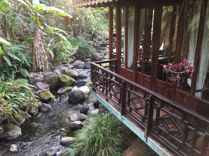 Nach diesem beeindruckendem Naturschauspiel erreichen wir unser nächstes Quartier, das Sinouk Coffee Resort. Der Name ist Programm, das Resort liegt in einer Kaffeeplantage. Ein kleiner Bach fließt hindurch und im Hotelgarten blüht ein Blumenmeer, wo man mit etwas Glück riesige Schmetterlingsfalter beobachten kann. Mir ist im Hotelgarten ein Falter mit rund 20 cm Flügelspannweite begegnet, ein solches Exemplar hatte ich zuvor nur auf Schmetterlingsfarmen gesehen, doch noch nie in freier Natur. Wir sind in einem Chalet untergebracht und die Kinder im ehemaigen Haus des Besitzers, direkt am Fluss und eingerichtet wie ein Museum. Wir fühlen uns wie in die Kolonialzeit zurückversetzt und genießen zwischendurch die hier kühlere Luft am Hochplateau und die traumhafte Gartenanlage.