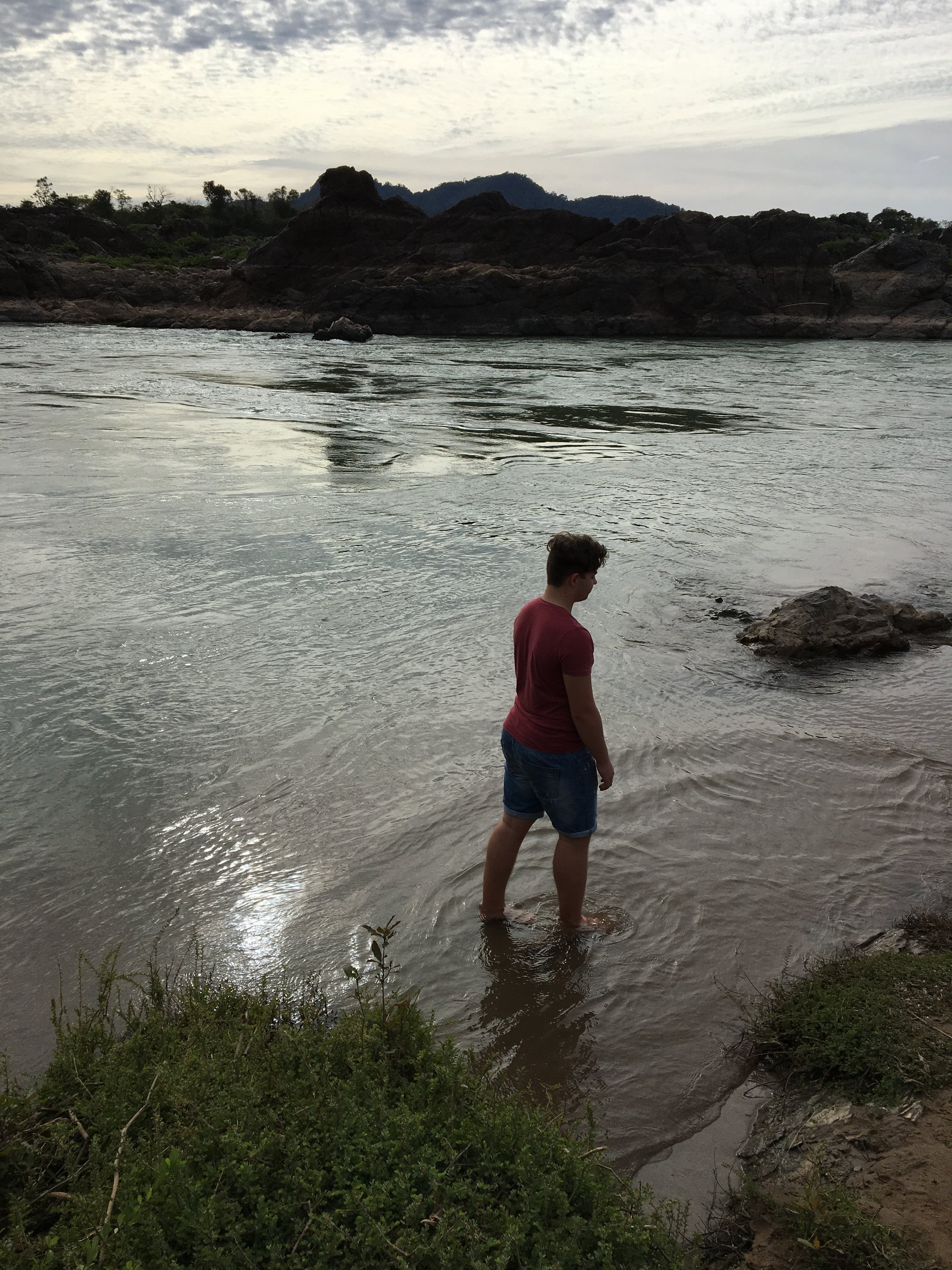 Meiner besseren Hälfte und dem jüngeren Sohn ist nach „Chillen“, der Ältere verlangt nach Action. Wir mieten uns Fahrräder zu je 10.000,- Kip (etwa ein EURO) und radeln noch einmal zu den Li Phi Wasserfällen, fahren unterwegs ein paar Nebenwege und kleinere Wasserfälle auf der Insel ab. Und ohne besorgte Blicke von der Mutter zu ernten, hält uns nichts davon ab, Sandstrand und Strömung des Mekong bis zum Absperrseil zu erforschen.
