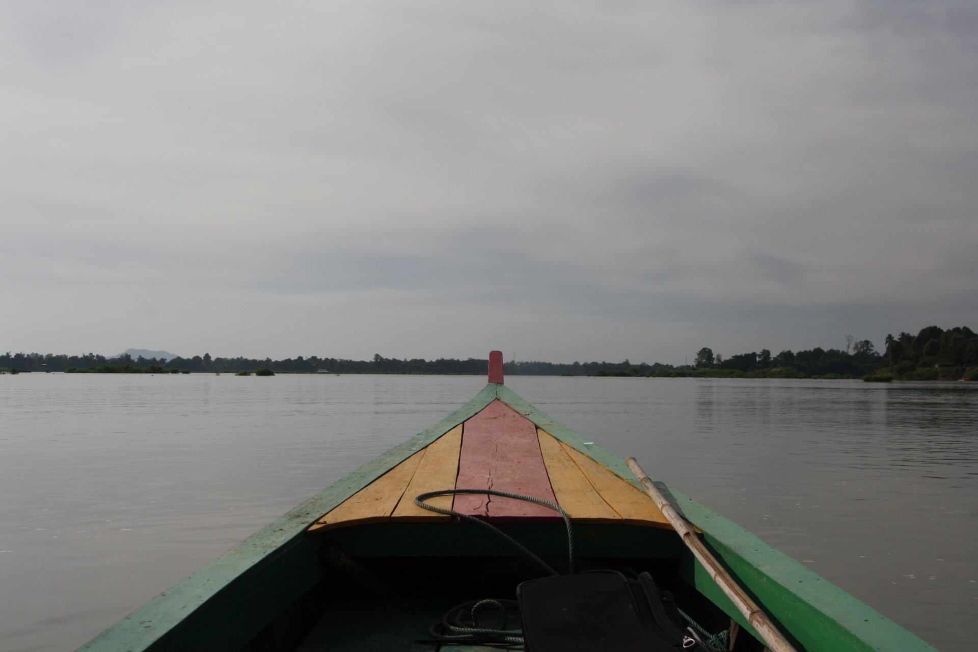 Unser Boot liegt bereit, es geht los! Wir fahren ein Stück auf dem breiten Mekong, das Ufer auf der gegenüberliegenden Seite gehört schon zu Kambodscha. An dieser Seite scheint das Wasser still zu stehen, von der nördlichen, laotischen Seite fließen immer wieder Nebenarme mit starker Strömung in das breite Flussbecken.
