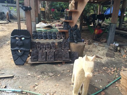 Vorher jedoch machen wir Halt in Ban Nong Beung, einem „Schnitzerdorf“ der Ta Oy. Die ethnische Minderheit ist für ihre Schnitzkünste berühmt, in beinahe jedem Haus ist dieses Handwerk zu finden. Dementsprechend stehen überall an den Wegen Skulpturen und wer will, kann den Handwerkern zuschauen. Diese Szenerie, das wird schnell klar, ist keineswegs für Touristen arrangiert, sondern schlicht und einfach der Alltag der Menschen. Und deshalb gibt es in dem Dorf erfreulicherweise auch keine Souvenir-Geschäfte.