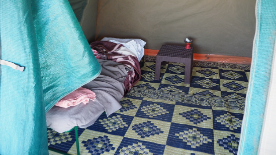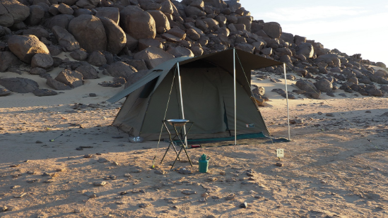 Die großen Igluzelte (3mx3mx2m) des Camps sind mit Lagerbetten, Schaumstoffmatratzen, Laken, Wolldecken, einem kleinen Tisch und zwei Klappstühlen ausgestattet. Die Mahlzeiten werden in einem großen Restaurantzelt serviert, das sich zwischen den wunderschönen Granitfelsen und der Wüste in Tombos befindet. Alle Gäste sitzen an einem Tisch und nehmen das köstliches Frühstück und Abendessen im Buffet-Stil gemeinsam ein. Eine schöne Gelegenheit um Kontakte zu knüpfen und Eindrücke auszutauschen. Campingduschen und Toiletten ergänzen die Struktur.