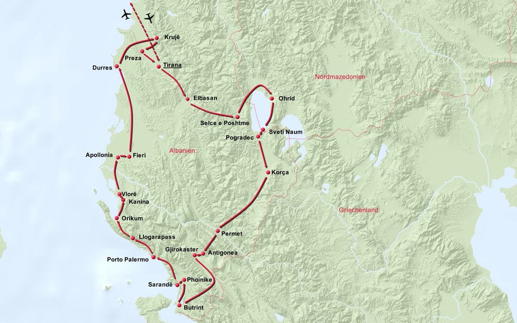 Tirana Elbasan Selce e Poshteme Ohrid Sweti Naum Pogradec Korca Permet Antigonea Gijrokaster Butrint Phoinike Saranda Vlora Himara Porto Palermo Qafa e Llogarase Vlore Apollonia Fieri Durres Kruja Preza Tirana