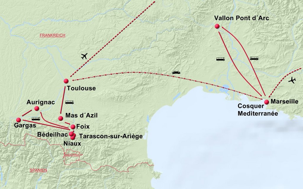 Die weiteren Tage widmen wir den Besuchen fantastischer Fundstellen und Höhlen in den östlichen Pyrenäen südlich von Toulouse. Dort haben wir das Privileg originale Gravierungen, Malereien und mobile Kunstobjekte aus der Altsteinzeit betrachten zu können. Es erwarten uns gigantische Höhlen, die Wissenschaft prägende Fundorte und Einblicke in die Lebenswelt unserer Vorfahren. Dabei bewegen wir uns in einer landschaftlich traumhaften Umgebung, genießen französische Küche und erlauben uns auch einige Blicke auf die entzückenden mittelalterlichen Städte der Region.