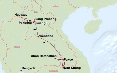 Stationen der Route: Houy Xay (Laos Grenze) Pakbeng Luang Prabang Vientiane Pakse Wat Phou Mekong Inseln Pakse Chongmek (Laos Grenze) Ubon Rajathani (Thailand)