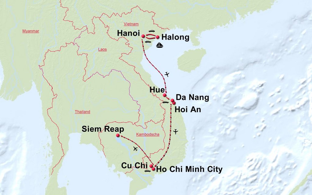 Stationen der Route: Hanoi Halong Bucht Hue Hoi An Ho Chi Minh City Siem Reap Tonle Sap