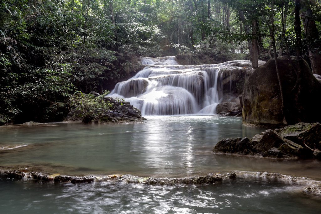 Bevor es in den Erawan Nationalpark geht, gilt der erste Halt am Morgen dem Besuch einer imposanten Lava Höhle. Danach führt die Reise mit dem Longtailboot und dem PKW in den Park. Er befindet sich 65 km von Kanchanaburi entfernt und hat eine Größe von 550 km². Dabei ist der siebenstufige Erawan Wasserfall mit seinen kleinen natürlichen Pools und dem smaragdfarbenen Wasser besonders beeindruckend. Deshalb bleibt hier auf jeden Fall genügend Zeit die malerische Umgebung zu erkunden und auch für eine Abkühlung im Wasser!