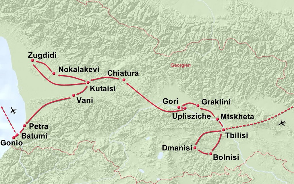 Tiflis Dmanisi Bolnisi Mzcheta Bagineti Grakliani Gori Khovle Gora Uplistsikhe Chiatura Katskhi Kutaisi Nokalakevi Zugdidi Vani Petra Batumi