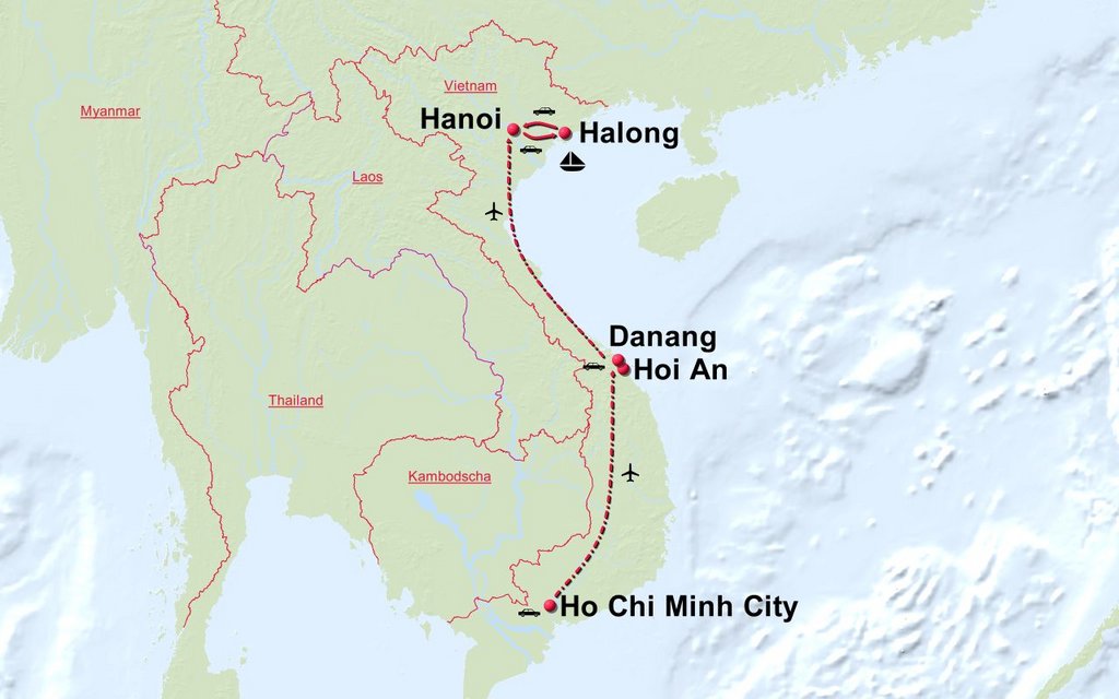 Stationen der Route: Ho Chi Minh City Hoi An Hanoi Halongbucht Hanoi