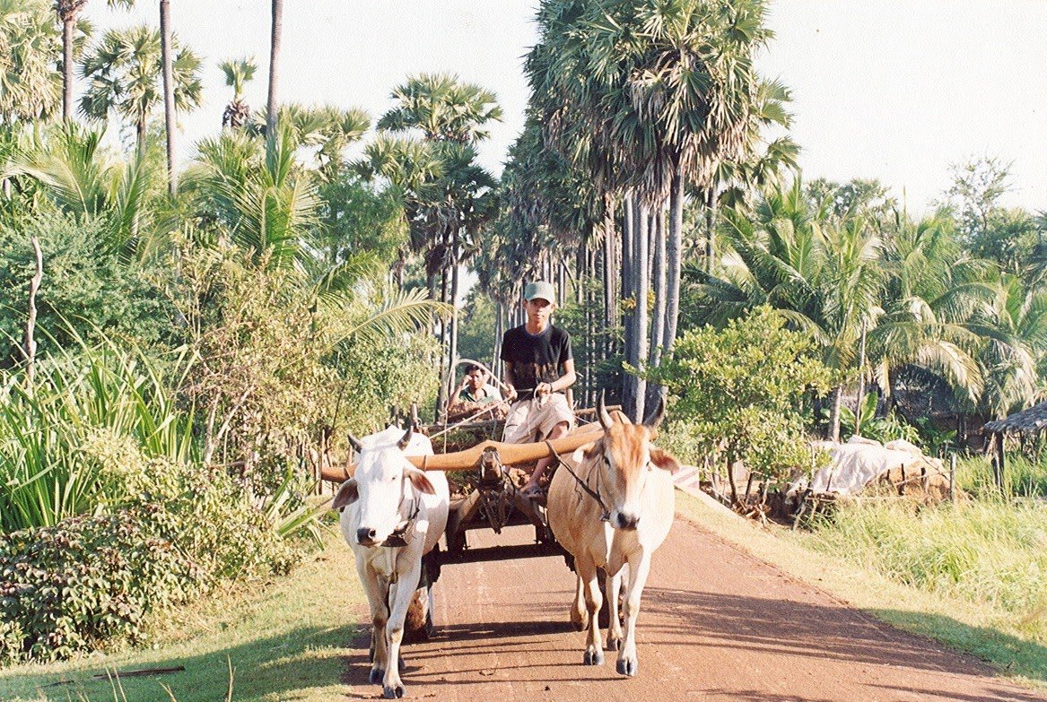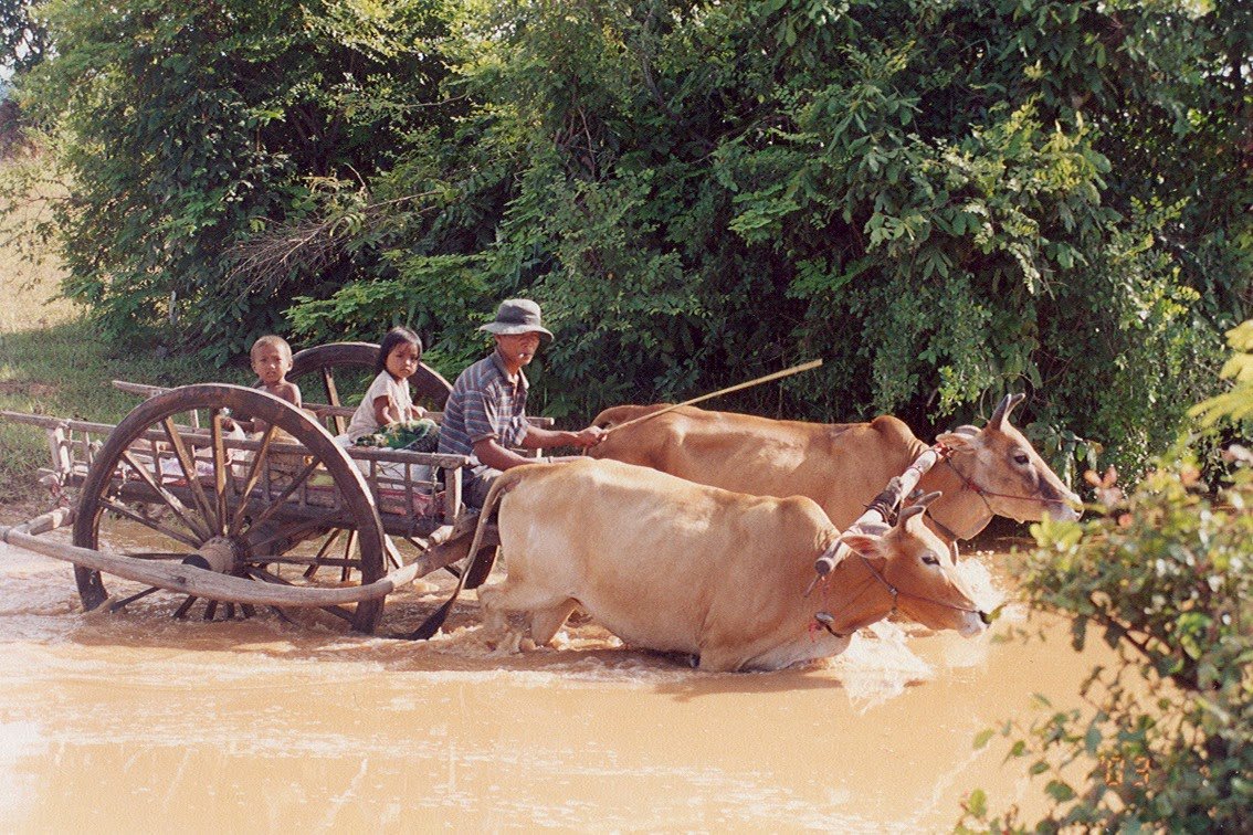 Nach einer Segenszeremonie und dem Mittagessen gehen wir am Flussufer wieder von Bord und besteigen einen traditionellen Ochsenkarren. Damit zuckeln wir durch die Landschaft zur "Green School", die von Heritage Line unterstützt wird und Kindern in dieser abgelegenen Gegend Bildung ermöglicht.