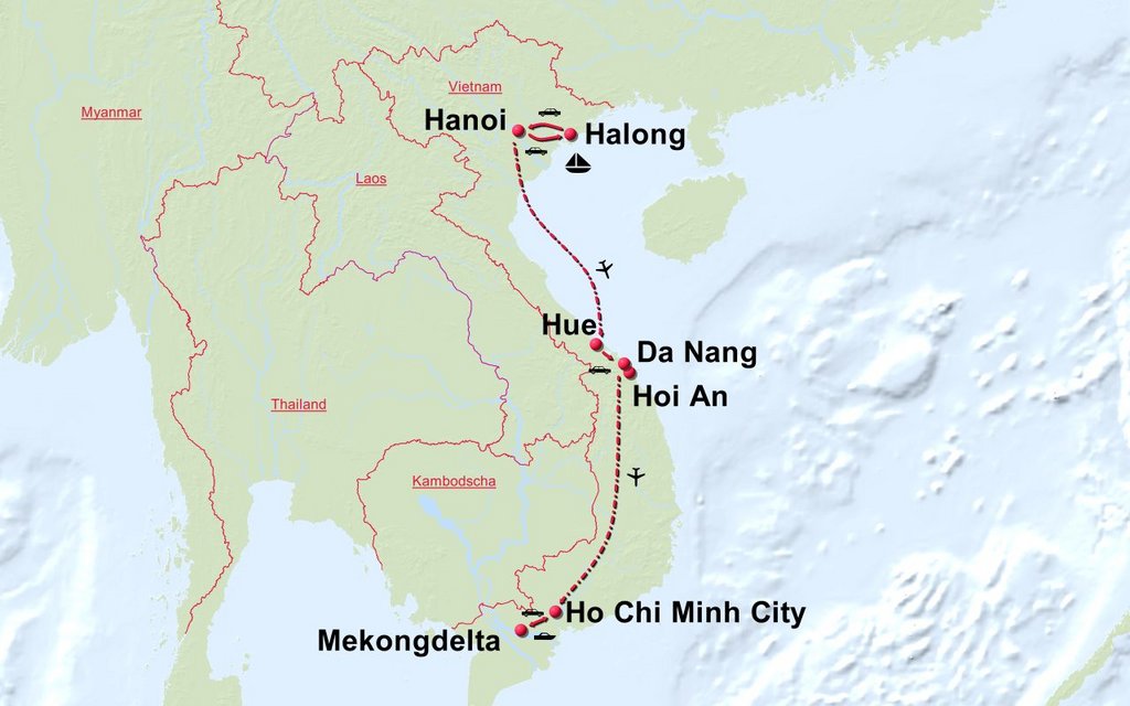 Stationen der Route: Hanoi Halongbucht Hanoi Hue Danang Hoi An Ho Chi Minh City Cu Chi Tunnel Ho Chi Minh City
