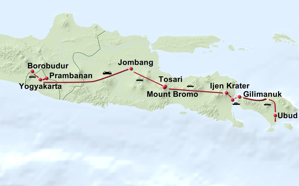 Bei dieser englischsprachig geführten Gruppentour erkunden wir die Highlights der faszinierenden Insel Java. Dabei erwarten uns geheimnisvolle Vulkanlandschaft, faszinierende Tempelbauten und kleine Orte. Unterwegs sind wir mit dem Bus, dem Zug und der Fähre und genießen überall atemberaubende Aussichten auf Reisfelder und Berge. Eine kompakte Tour, die einen tollen Einblick in das Leben und die Kultur Javas gibt. Die Tour endet in Bali, wo der Indonesienaufenthalt mit einer weiteren Rundreise oder einem erholsamen Badeaufenthalt fortgesetzt werden kann.