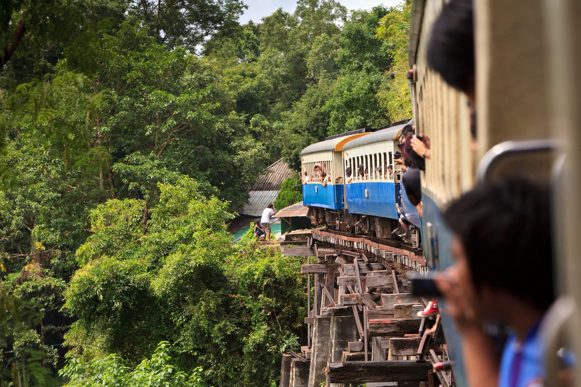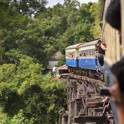 Auf nach Kanchanaburi! Unseren ersten Halt legen wir am Wat Tham Sua ein. Den Tempel am Berggipfel erreichen wir bequem mit der Standseilbahn. Unser Reiseleiter erklärt uns das Tun der Einheimischen - wie klebt man Blattgold auf die Buddhastatuen und wie zündet man die Räucherstäbchen richtig an. Es kann nicht schaden ein paar Baht zu investieren und es ihnen gleichzutun! Dann geht es weiter zum riesigen Regenbaum - der Schattenspender ist beeindruckend. Schließlich legen wir einen Halt am Friedhof ein, wo unzählige Kriegsgefangene aus dem 2. Weltkrieg ihre letzte Ruhestätte fanden. Sie waren vorwiegend beim Bau der Bahnstrecke und der Brücke am Kwai eingesetzt. Die geschichtsträchtige Brücke ist unser nächstes Ziel und dann geht es mit einer Fahrt in der historischen Todesbahn ein Stück weiter. Unser Blick fällt dabei auf den Fluss, auf steil abfallende Hänge neben der Strecke und grüne Felder.