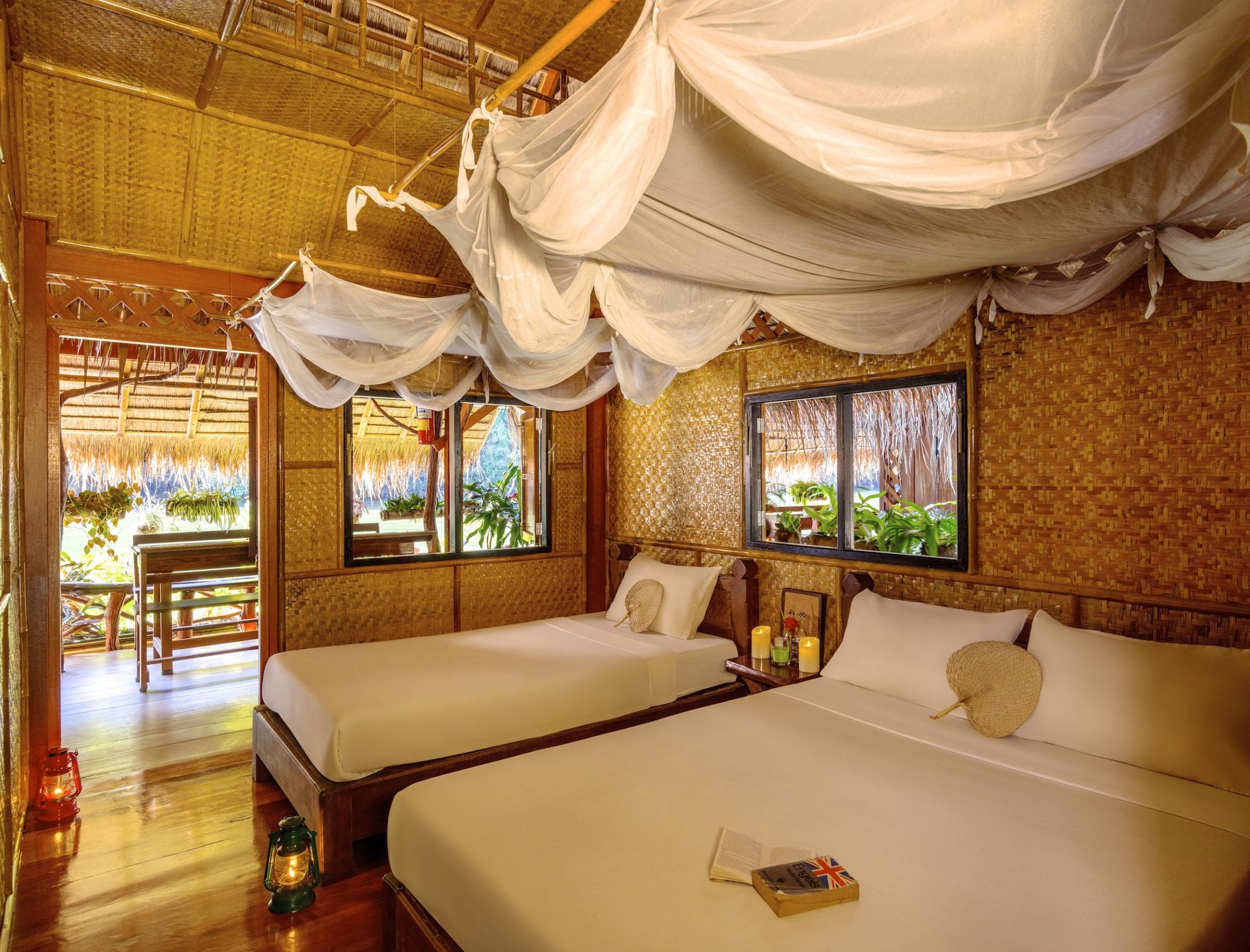 Die Beleuchtung im River Kwai Jungle Raft erfolgt ausschließlich mit Laternen und es gibt keinen Strom und kein Wlan. Es ist eine einfache aber einzigartige Unterkunft, ideal für ein kleines Abenteuer. Nehmen Sie eine Taschenlampe mit!