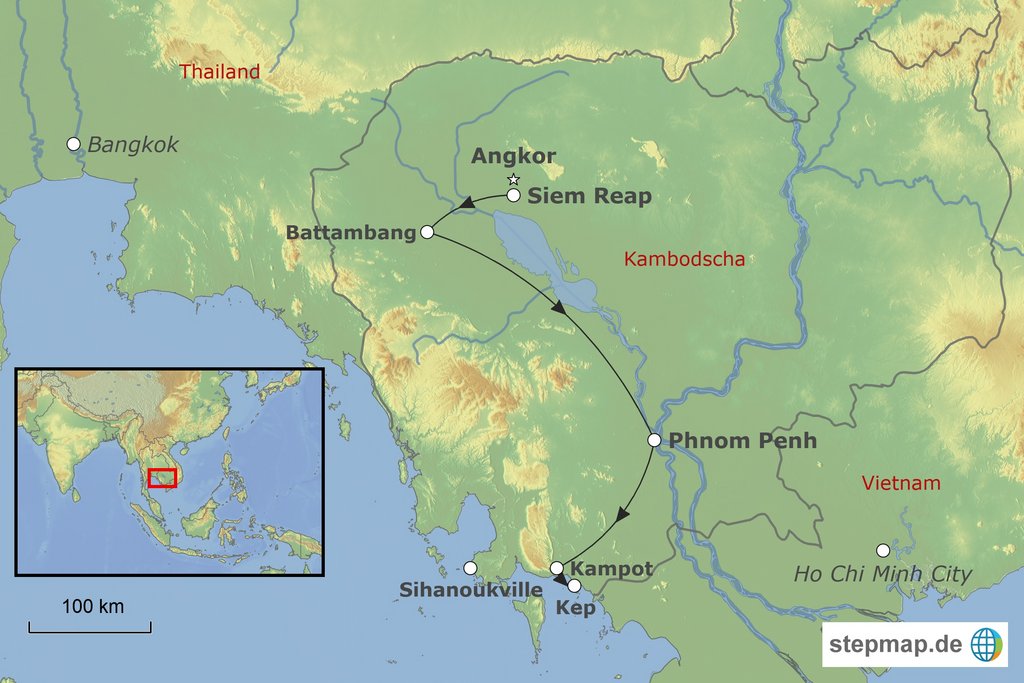 Stationen der Route: Siem Reap Battambang Phnom Penh Kampot Kep