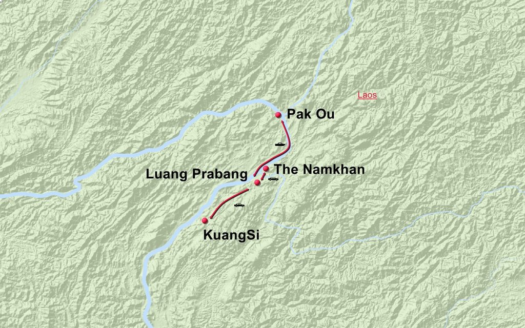 Stationen der Route: Stationen der Route: Luang Prabang Kuang Si Wasserfälle Minderheitendörfer Morgenmarkt Luang Prabang Pak Ou Höhlen Ecoresort mit traditioneller Farm