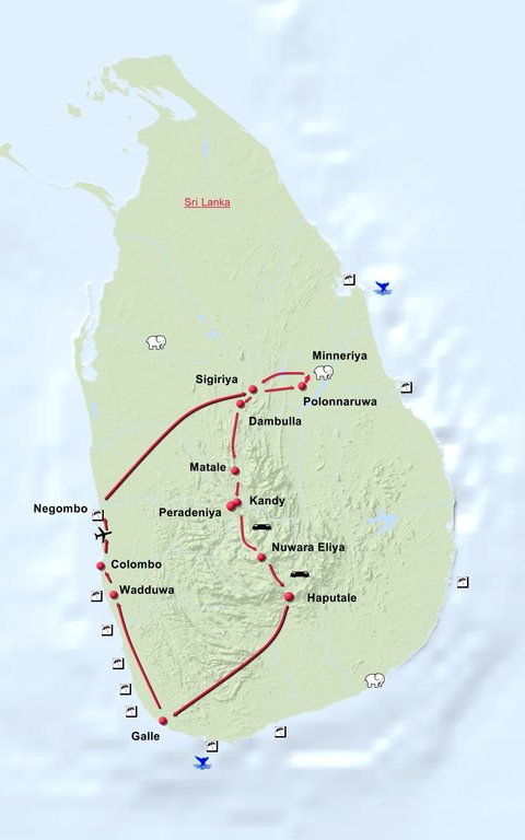 Stationen der Reise: Negombo Umandawa Sigiriya Polonnaruwa Minneriya Dambulla Matale Kandy Nuwara Eliya Haputale Galle Wadduwa Colombo