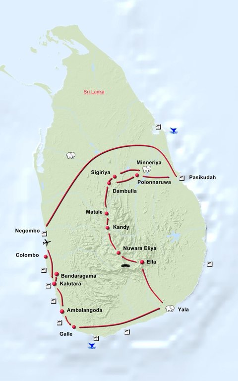 Stationen der Reise: Kalutara Bandaragama Kalutara Galle Yala Ella Nuwara Eliya Kandy Matale Dambulla Sigiriya Mineriya Dambulla Polonnaruwa Pasikudah Negombo