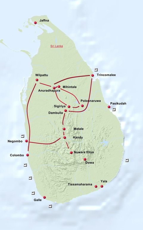 Stationen der Reise: Colombo Wilpattu Anuradhapura Mihintale Sigirya Polonnaruwa Trincomalee Dambulla Kandy Nuwara Eliya Negombo