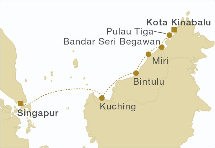 Stationen der Reise: Wien Singapur Kuching Bintulu Miri Bandar Seri Begawan Pulau Tiga Kota Kinabalu Wien