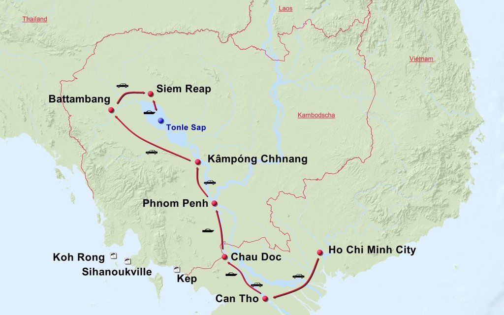 Stationen der Route: Ho Chi Minh City Cai Be Can Tho Cai Rang Chau Doc Phum Soai Phnom Penh Battambang Seim Reap