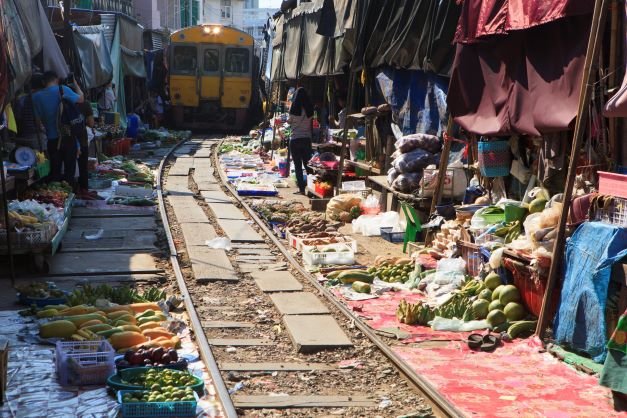 Bereits am frühen Morgen starten wir und fahren in die Provinz Samut Sakorn am Golf von Thailand. Hier besuchen wir den großartigen lokalen Mae Klong Railway Market. Immer noch kommen die Einheimischen täglich hierher, um die Waren des täglichen Bedarfs und Fisch zu handeln. Dabei führen mittlerweile die Schienen der Eisenbahn durch das Marktgebiet und die Händler räumen die Waren zur Seite, wenn der Zug durchfährt.