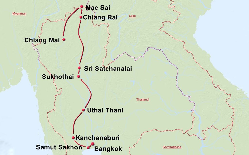 Stationen der Route: Bangkok Kanchanaburi Uthai Thani Sukothai Sri Satchanalai Chiang Rai Goldenes Dreieck Mae Sai Chiang Mai