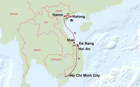 Stationen der Route: Hanoi Halongbucht Hanoi Hue Danang Hoi An Ho Chi Minh City