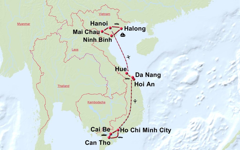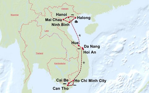 Stationen der Route: Hanoi Mai Chau Hang Kia Mai Chau Pu Luong Ninh Binh Halongbucht Hanoi Hue Danang Hoi An Ho Chi Minh City Mekongdelta Ho Chi Minh City